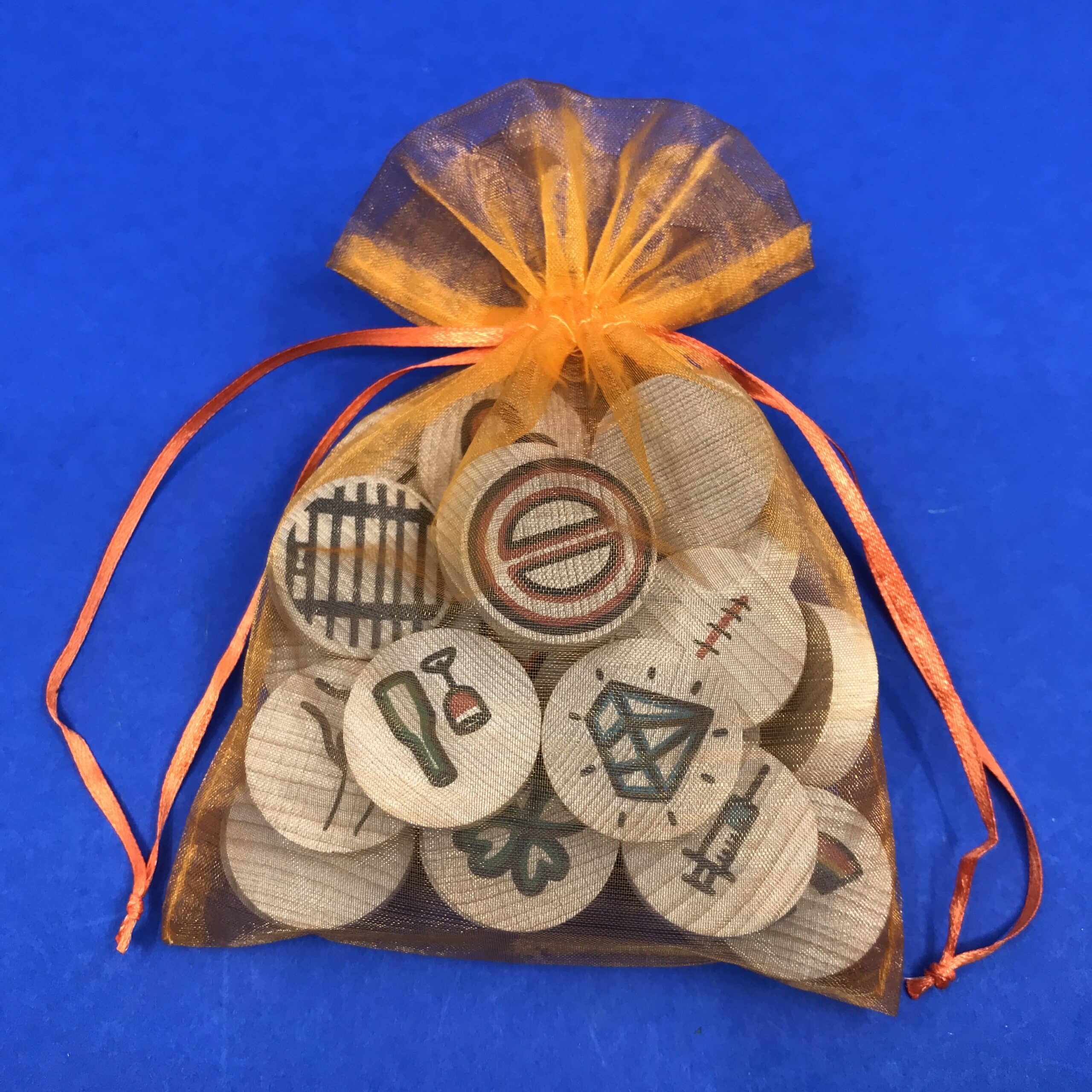 Je ontvangt 27 schijfjes met verschillende symbolen en 3 blanke schijfjes (Ø 3 cm, 0,8 cm dik). De blanke schijfjes zijn al voor je gelakt met blanke lak. Je kunt hierop met een watervaste stift je eigen symbool tekenen.